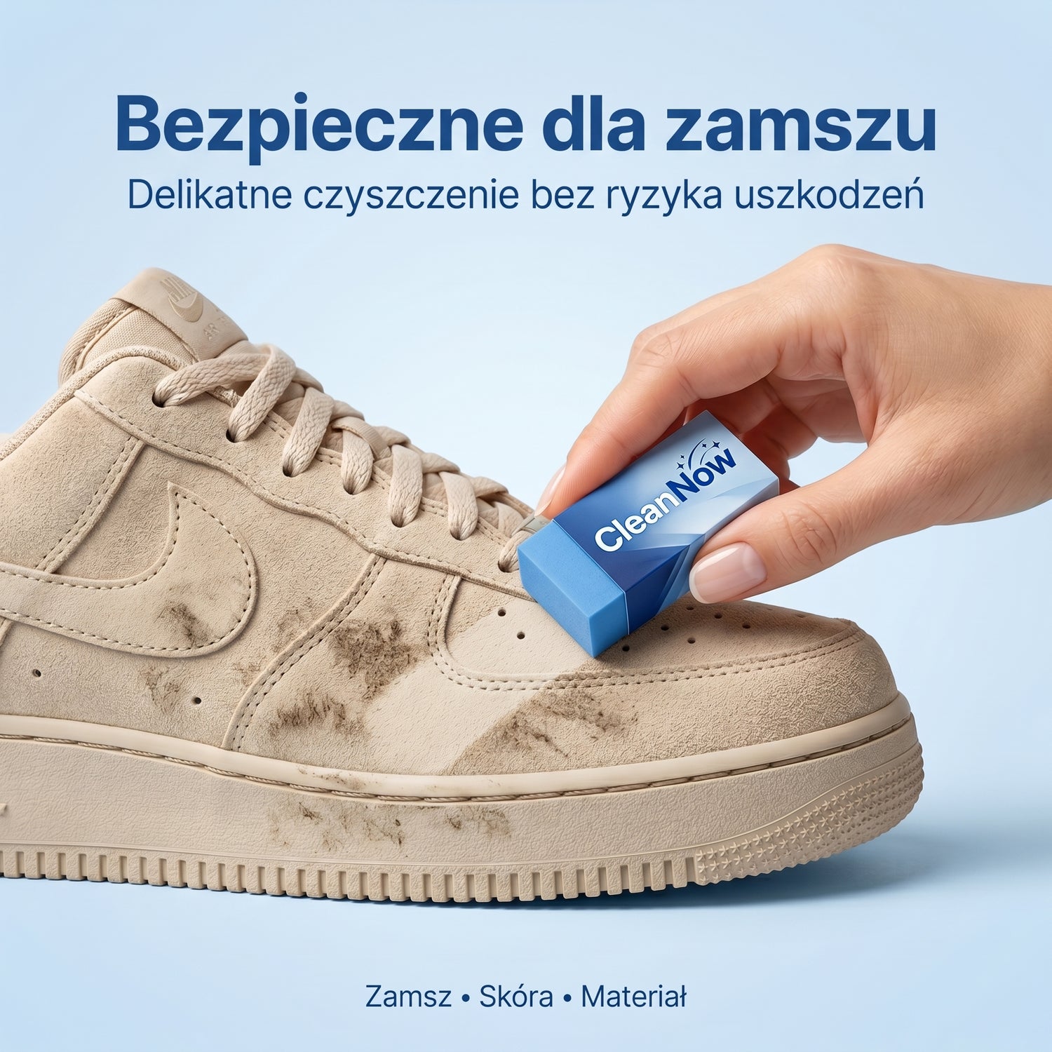 Tak – CleanNow jest bezpieczny dla zamszu, skóry i materiałów. Usuwa zabrudzenia bez ryzyka uszkodzenia struktury buta.